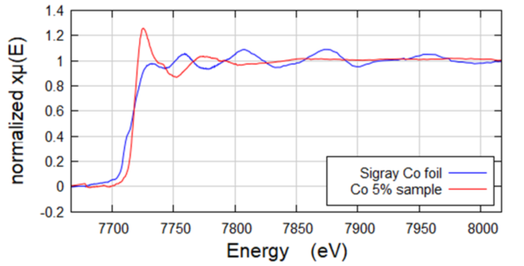 Fluorescence geometry EXAFS of Co in NMC Samples. Co (~3-5wt%) was low in the NMC battery samples, which were Ni-dominant. Analysis of the EXAFS shows that there are slightly longer bond lengths in the charged sample. Further, the XANES region shows that the Co in the discharged sample is reduced. Collected on QuantumLeap-H2000 using Ge-311 Johansson crystal.
