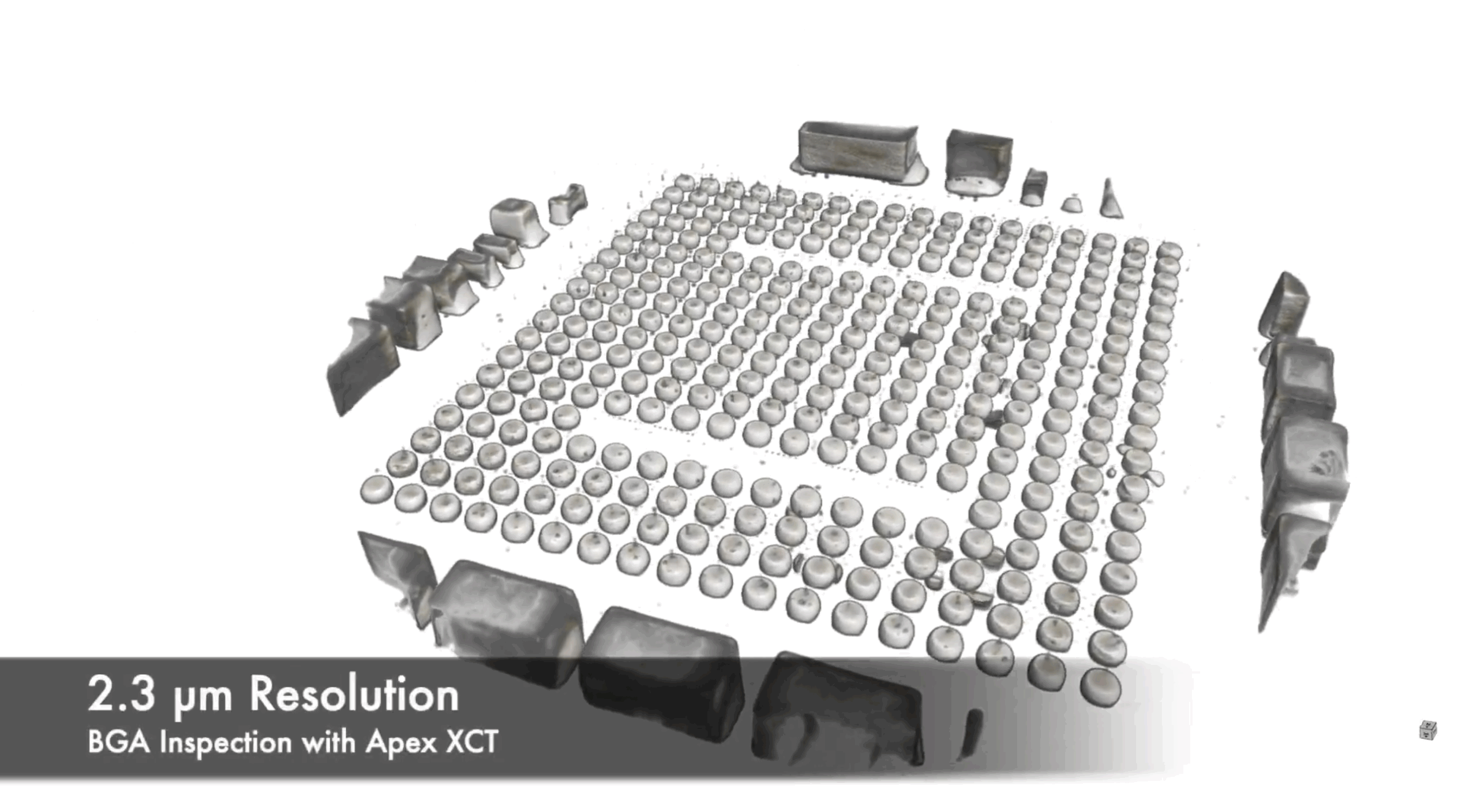 Commercial board scanned at multiple FOVs and voxel sizes: 8 um LFOV (board-level), zooming in at 4 um (component-level), and finally at 1.5 um. LFOV required 20 volumes stitched together and was achieved at only 36 minute per scan. - Imaged on Apex XCT